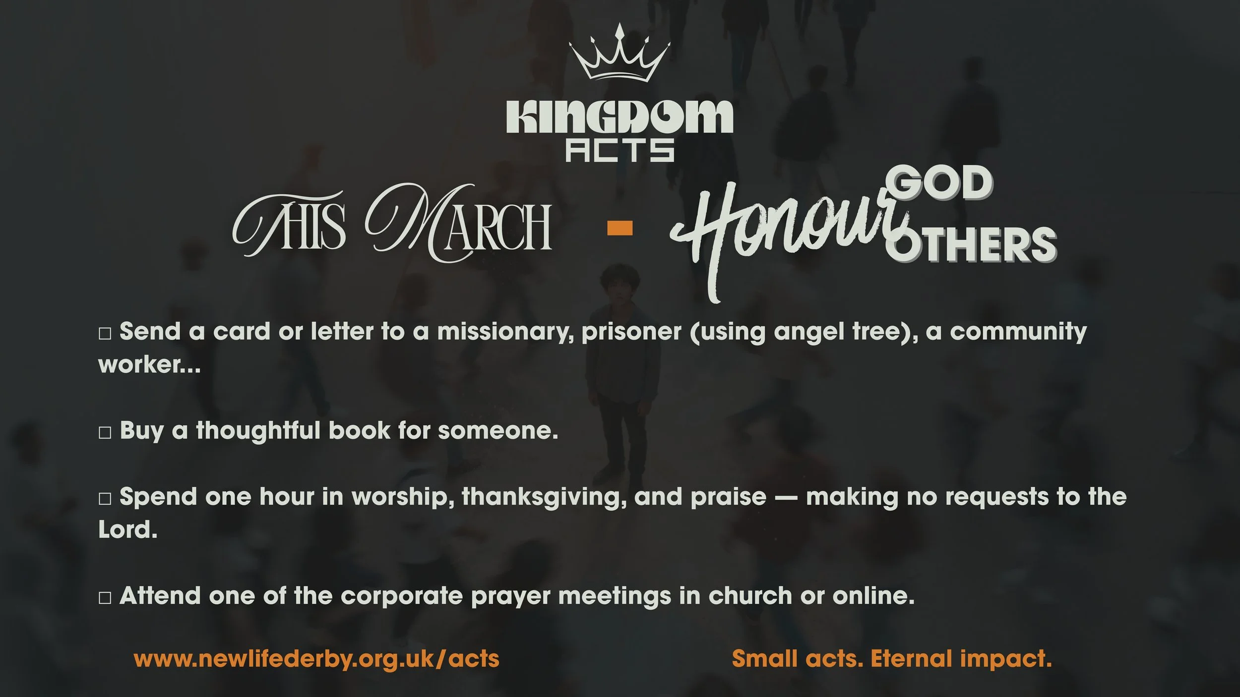 Each month, choose one simple act and live out the Kingdom where God has placed you.